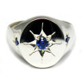 オーバルリングのトップと両サイド3か所にSAPPHIREをスターバースト型に留められた小細工なしの技術が光るストレートなデザイン。